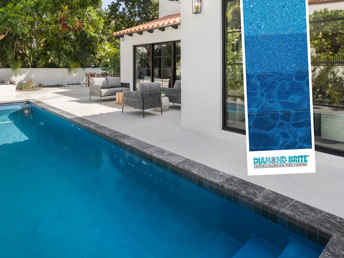 The pool finish material selected was Diamond Brite™ aggregate plaster in Midnight Blue, a popular deep blue color with rich tones and great contrast. Stone aggregate plaster finishes last longer than traditional plaster, with the added benefit of providing natural coloration.